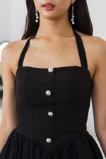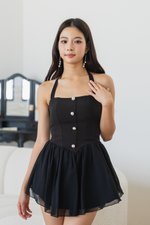Belle Pearl Button Halter Padded Romper Dress (Black)