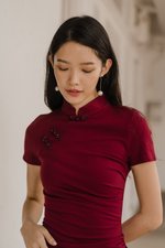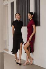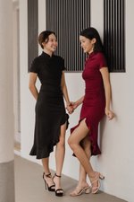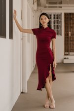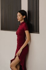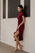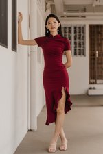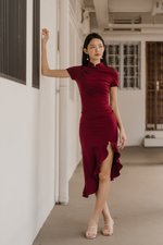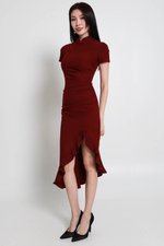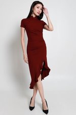 Leyue Ruched Ruffle Dress (Maroon)