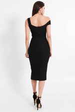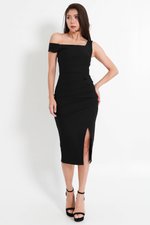 *Premium* Freya Asymmetrical Ruched Midi Dress (Black)