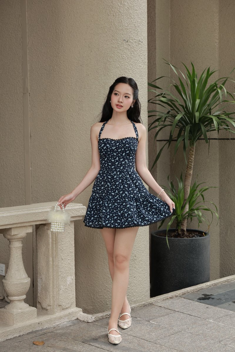Seorena Lace Halter Padded Dress V2 (Navy Floral)